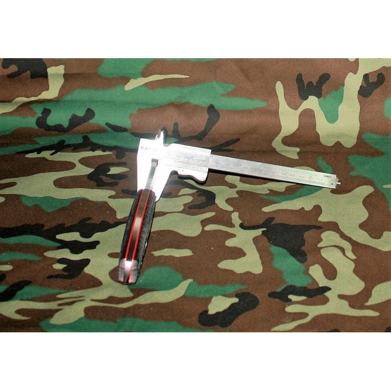Imagen del cuchillo de canto la parte sin filo, podemos observar que es plano sin sierra . Las dos lineas rojas son separadores y están entre el metal y las cachas de Micarta. Mas tarde os indicare los beneficios de este canto liso.