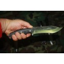Aquí observareis el agarre menos habitual del cuchillo pero no por ello menos importante , donde coseguireis gracias al diseño del mango con sus dos muecas o salientes un buen macheteo girando la muñeca. En el caso del modelo anterior era imprescindible debido a su menor tamaño.