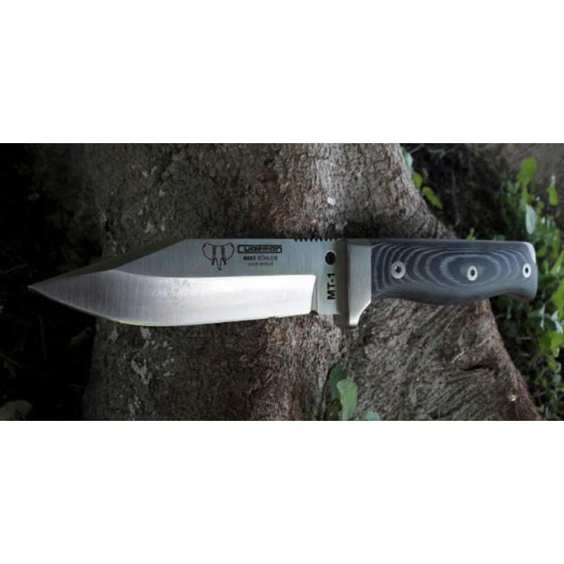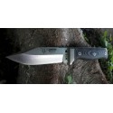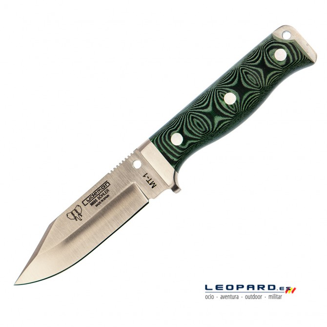 Cuchillo de supervivencia con hoja enteriza de Acero Böhler. Guarda de acero inoxidable, cachas de micarta verde. Incluye hueco para colocar el fiador. Longitud  total 225 mm. Incluye funda de cuero negro multiposición.