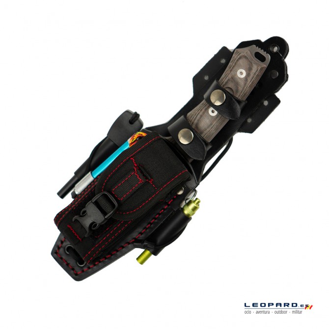 El usuario no deberá preocuparse nunca por el transporte del cuchillo, junto con su Kit Plus, ya que los tres cuchillos de la Serie Chaman Kit Plus incorporan una funda de piel negra multiposición ambidiestra, que incorpora un pedernal y silbato. Además, se podrá ajustar de forma práctica a cualquier cinturón.