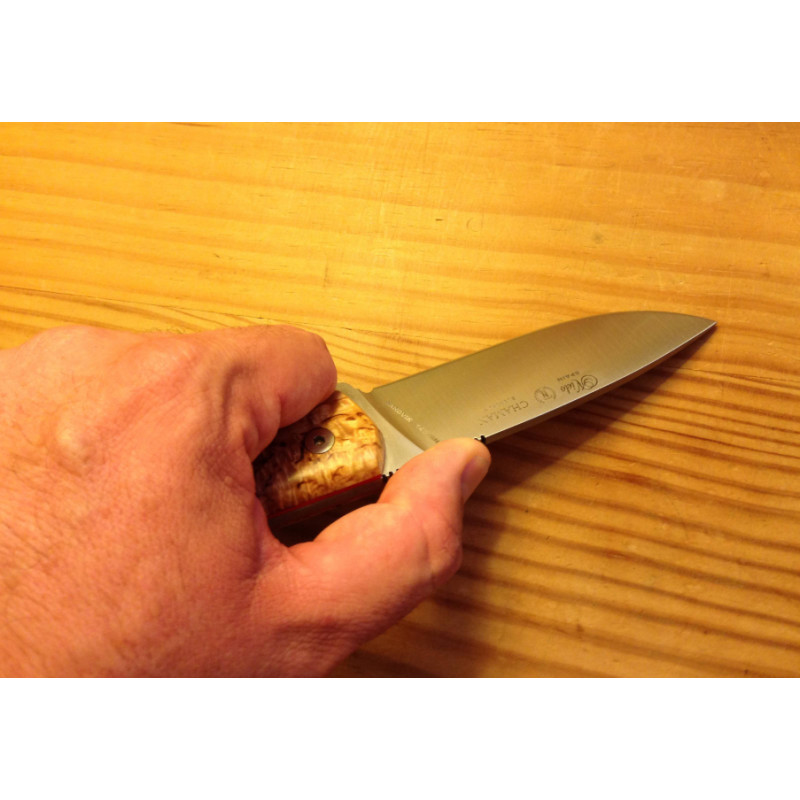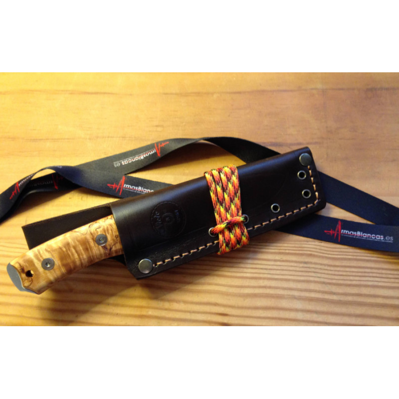 Cuchillo diseño de Manuel de la Torre y fabricado en España por Nieto con hoja enteriza fabricada en acero N695. Empuñadura fabricada en madera natural de Abedul rizado. Incluye agujero para cordón fiador. Incluye funda de piel marrón multiposición ambidiestra.