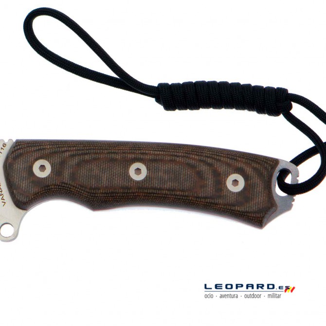 Otra de las características más destacadas de la empuñadura es que presenta un diseño robusto y ergonómico que mejora el agarre evitando que el cuchillo se resbale de las manos durante su utilización. Además, incorpora un agujero para cordón fiador.