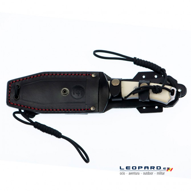 Este modelo incorpora una funda de cuero de color negro de altísima calidad y presenta la ventaja de ser multiposición y ambidiestra, por lo que el usuario podrá portar el cuchillo de una manera más segura y cómoda.