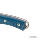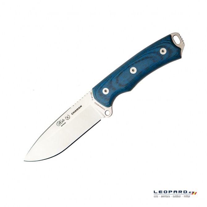 Cuchillo diseño de Manuel de la Torre y fabricado en España por la prestigiosa empresa de cuchillería Miguel Nieto. Hoja enteriza fabricada en acero Vanadio 1.4116. Lomo redondeado para golpeo sin dañar el palo. Empuñadura fabricada en katex de color azul con agujero para cordón fiador y muesca para hacer fuego por fricción. Zona diseñada para hacer uso del pedernal. Rompecristales almenado. Cachas desmontables con opción a repuesto. Incluye funda de piel negra multiposición ambidiestra.