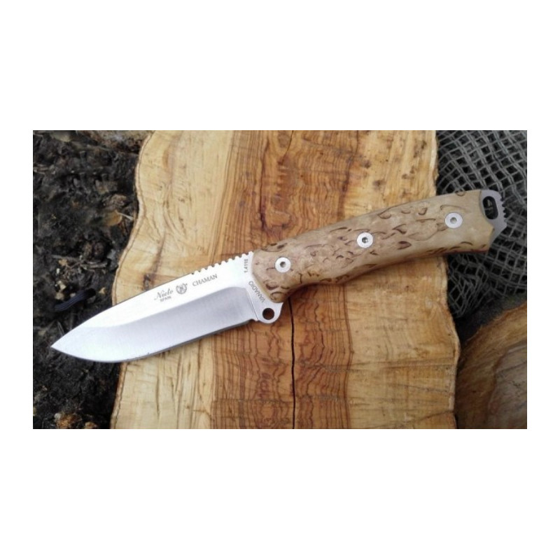 La Serie Chaman Kit es una de las más completas colecciones diseñadas por Miguel Nieto. Tienen la particularidad de estar fabricadas con un tipo de acero ultra-resistente a los impactos. Por este motivo, los usuarios podrán utilizarlo en caza, bushcraft o supervivencia. Del mismo modo, los clientes elegirán distintos acabados de empuñadura: