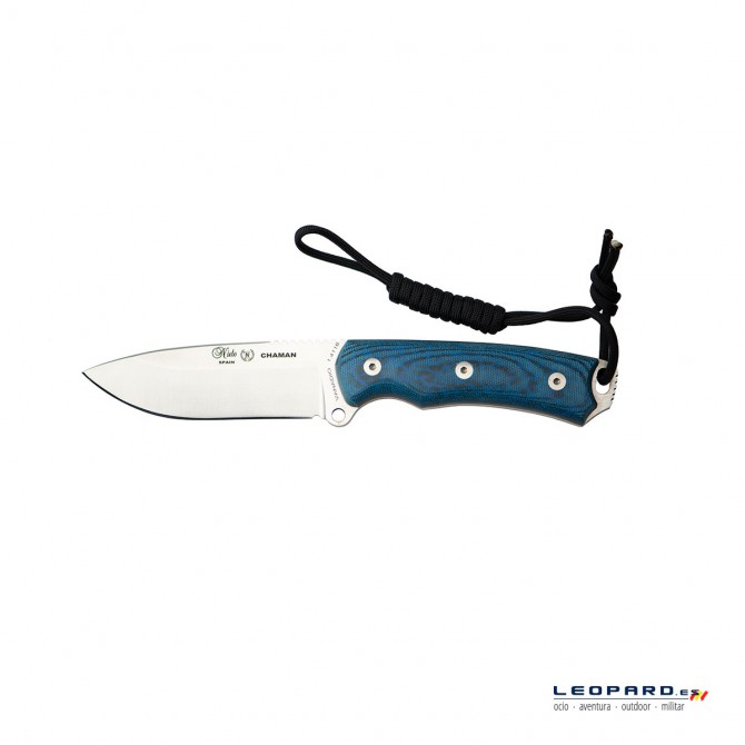 Como ya hemos señalado anteriormente, la característica diferencial de los seis cuchillos que forman la Serie Chaman Kit reside en el material de la empuñadura, aunque todas ellas disponen de una dureza superior y alto rendimiento frente a la fatiga. En este caso, se ha utilizado Katex Azul, un tipo de fibra natural.