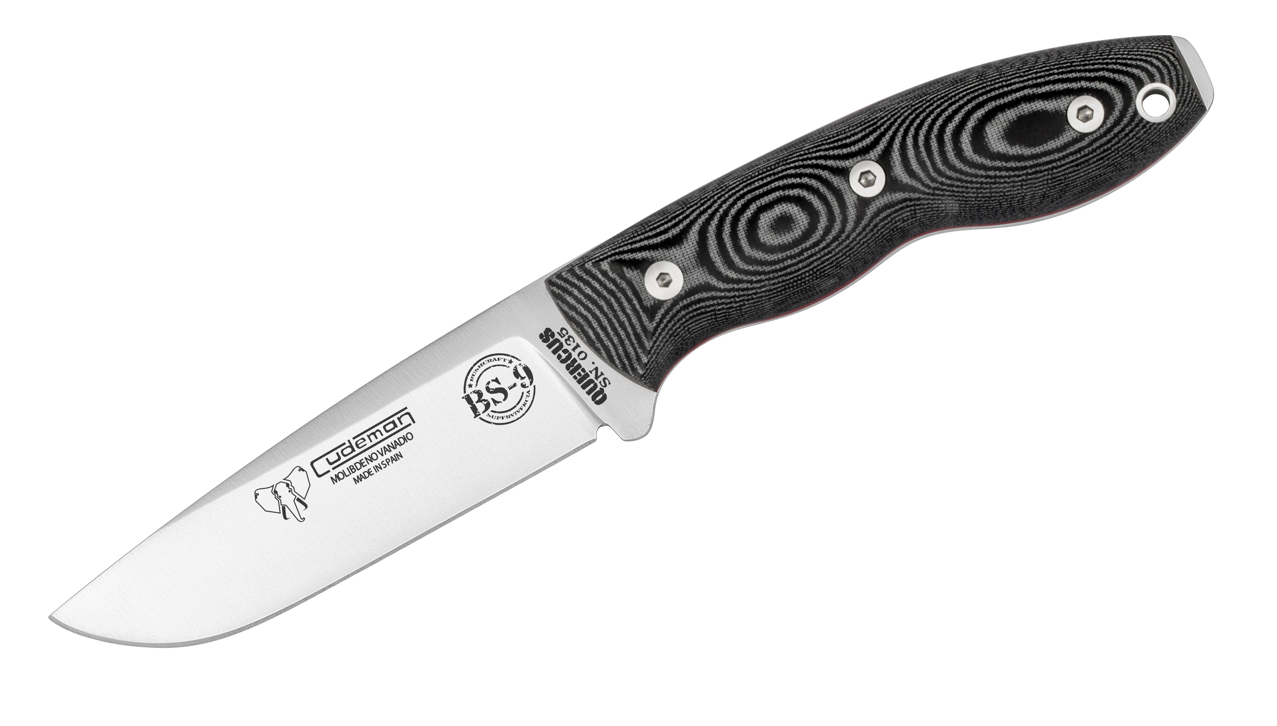 Cuchillo enterizo diseñado por José Sabater y testado por 9 Youtubers experimentados en cuchillos de supervivencia de España. Fabricado por la prestigiosa empresa de cuchillería Cudeman, con hoja fabricada en acero MoVa. Empuñadura fabricada en micarta de color negro con separadores de color rojo y lleva un agujero para hacer fuego por fricción con arco. Incluye agujero para cordón fiador y acaba en pomo percutor con cremallera. Incluye una funda de cuero multiposición de color marrón.