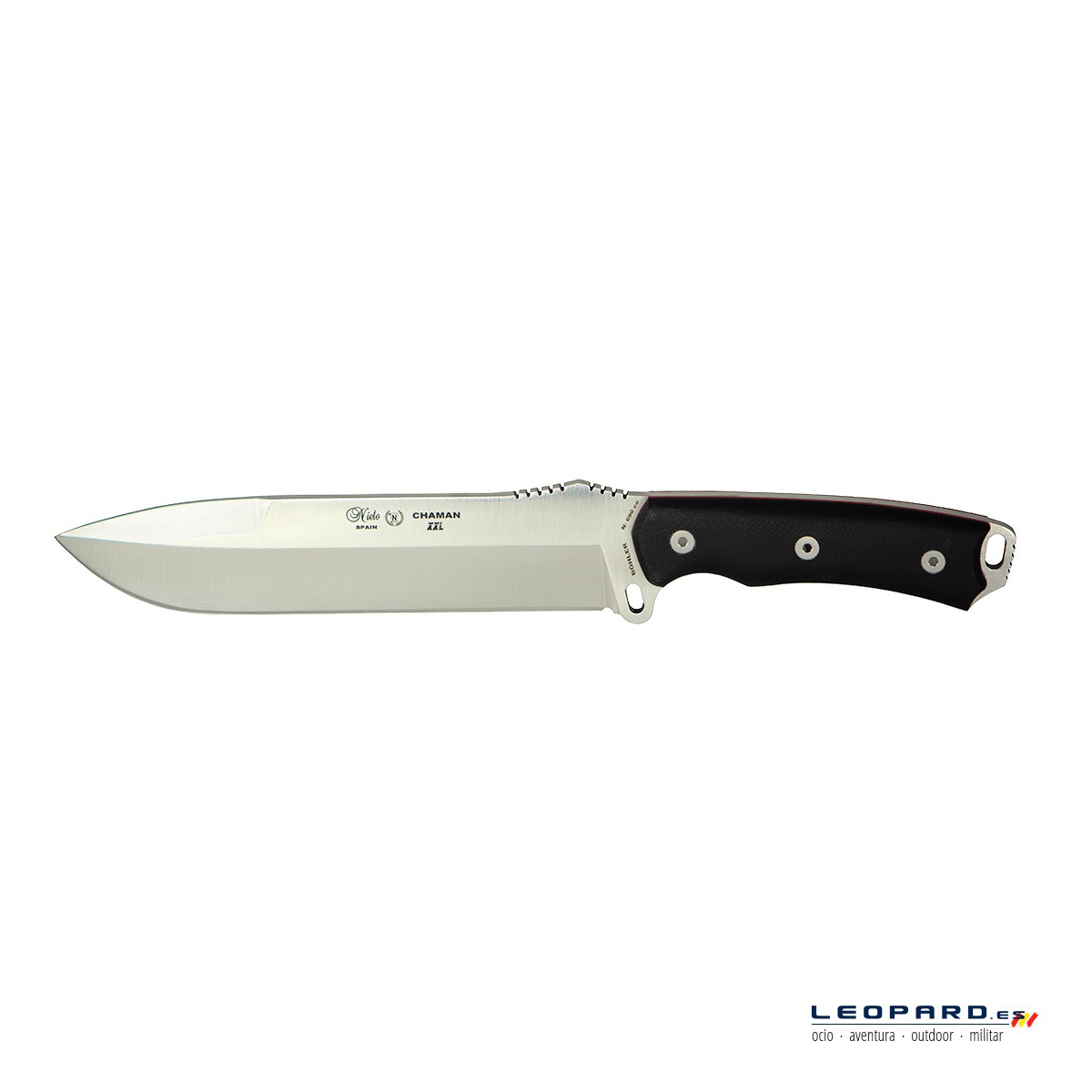 "Este cuchillo hereda la punta de la gama macro y táctico de los Chamanes, teniendo un contrafilo para favorecer la penetracion, especialmente en piezas de caza que sean mayores"