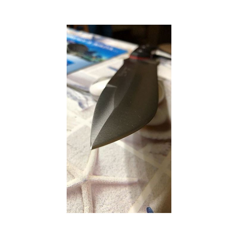 "El amplio lomo que tiene, esta redondeado desde la zona almenada hasta el inicio del contrafilo, lo que le confiere una mayor resistencia al desgaste en el uso de batoning y se coge mas fácil a modo de desollador"