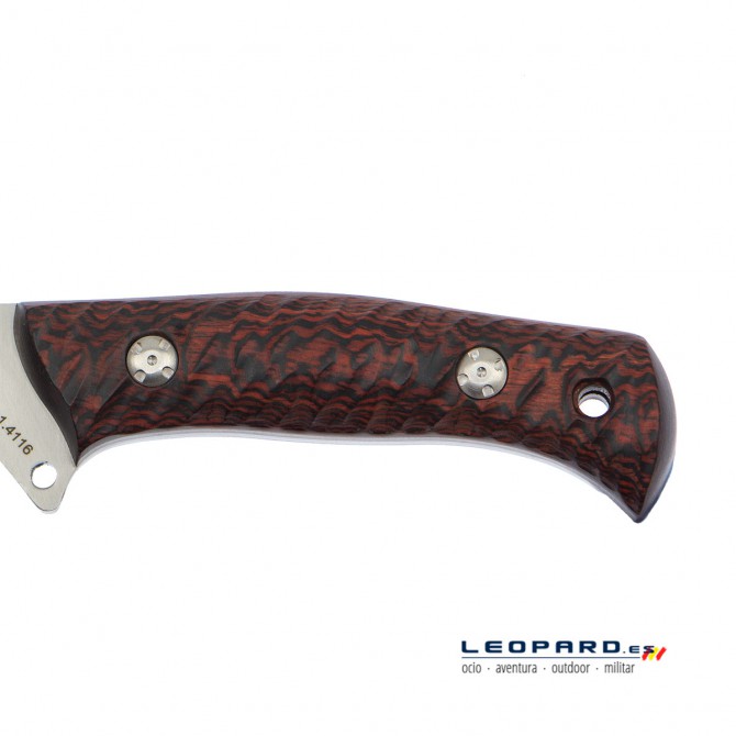 Los desarrolladores de Muela han fabricado la empuñadura de este cuchillo con madera prensada coral. Se trata de un material de origen natural muy robusto y duradero, que cuenta con un acabado en color marrón.