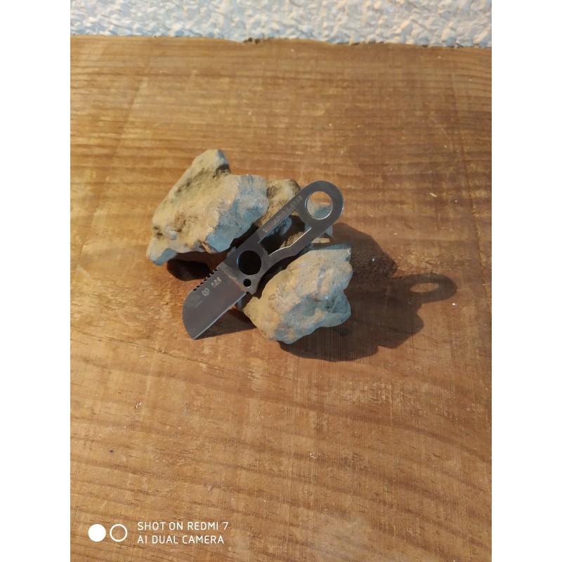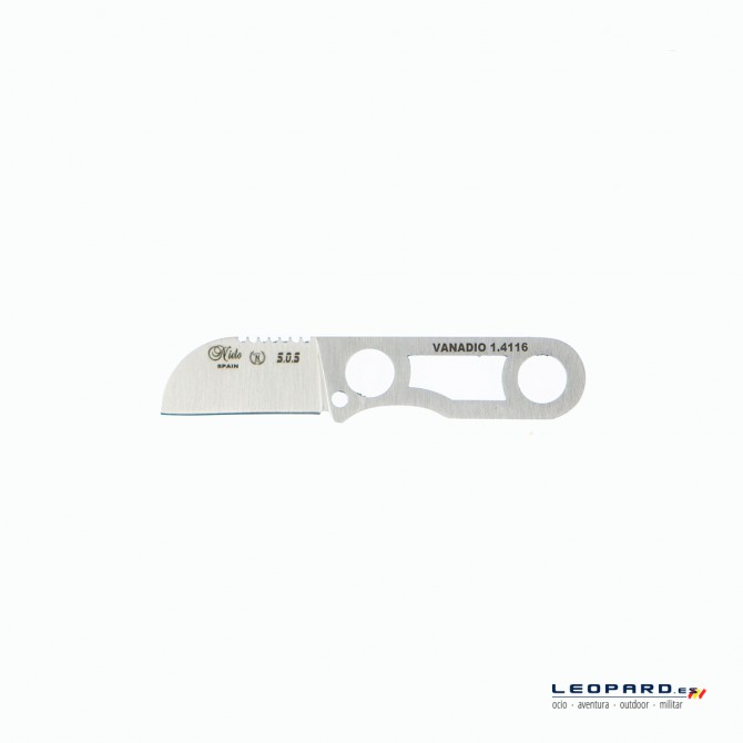 Cuchillo diseño de Manuel de la Torre y fabricado en España por la prestigiosa empresa de cuchillería Miguel Nieto. Hoja enteriza fabricada en acero Vanadio 1.4116. Cremallera en el lomo para trabajar con total seguridad, sin que se resbale. Empuñadura esqueletizada fabricada en acero Vanadio 1.4116 con agujero para cordón fiador. Incluye funda de Kydex. Color: Acero.