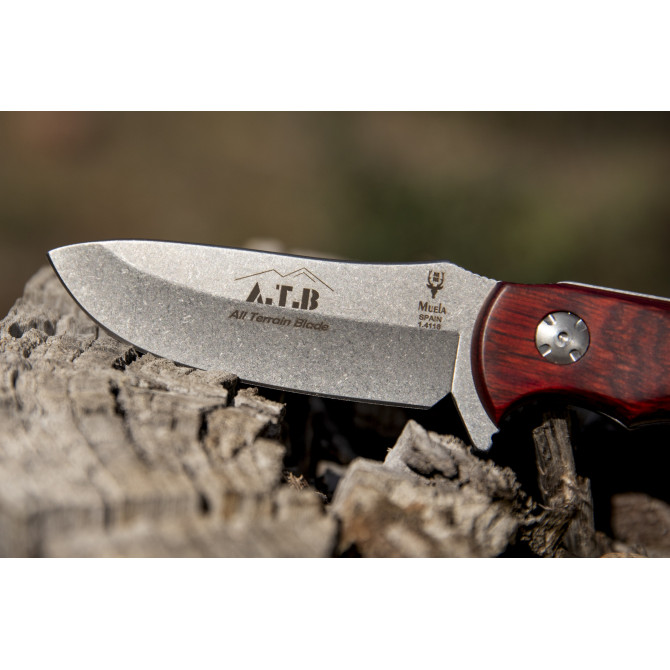 Este cuchillo Muela All Terrain Blade ATB-9.R tiene una empuñadura ergonómica fabricada en madera prensada coral (Palisandro Amazonas) con agujero para cordón fiador. Es una buena elección si lo que busca es un cuchillo de caza que no sea demasiado grande.