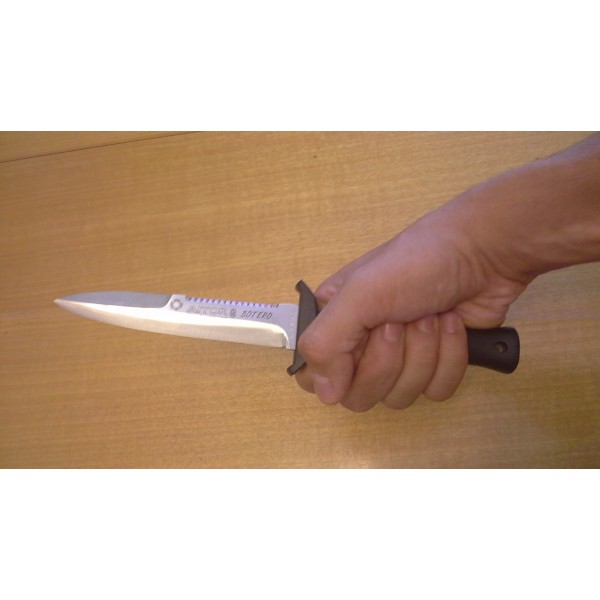 Buen lanzador con hoja mixta filo sierra lo cuan muy interesante en este tipo de cuchillos aunque de punta algo devil, sistema de cierre en la funda muy bueno para llevarlo y sacarlo con rapidez invertida-