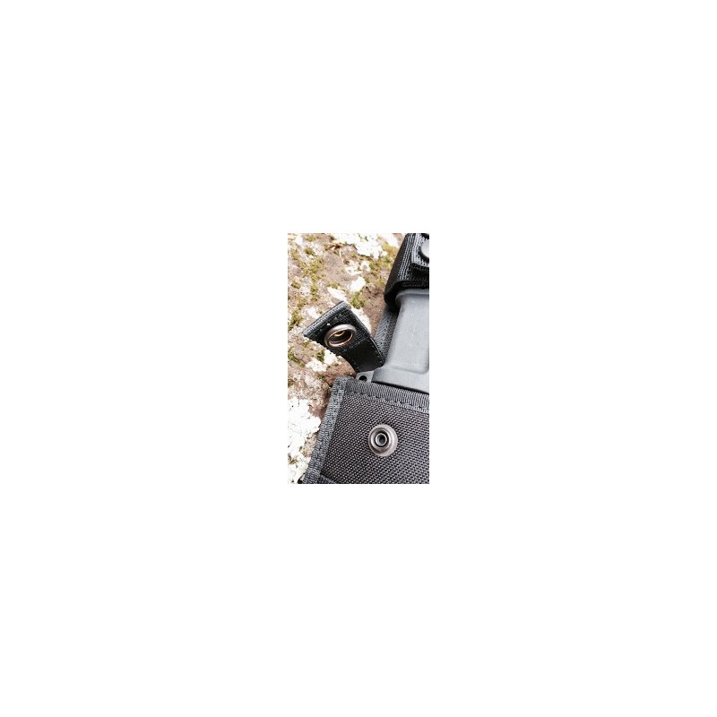 Tirante de seguridad de apertura rápida fuerte y fiable que sujeta el cuchillo de estas dimensiones de forma segura en una posición invertida .