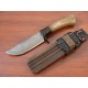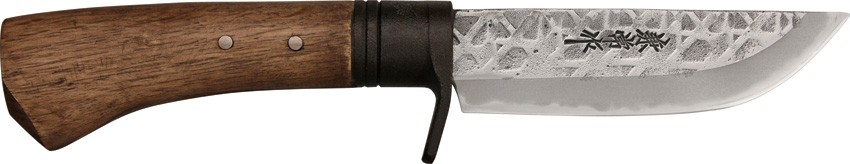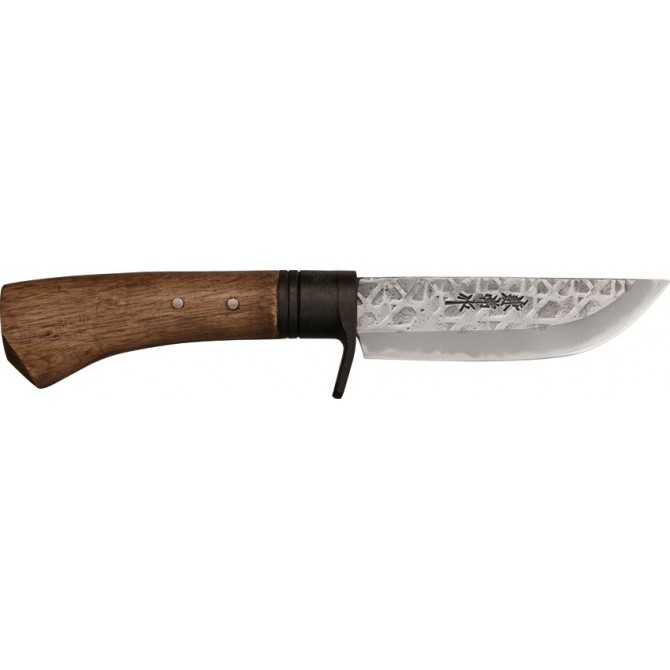 Cuchillo Kanetsune Sazanami Migaki. La hoja está fabricada en acero al carbono SRK-8 con acabado Tsuchime (martilleado). La empuñadura es de madera de Roble. Incluye funda de madera y cuero.