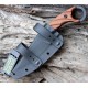 Overall: 8.5"; Blade: 4.25" | 1095 Carbon Steel | Standard Edge | Powder Coated Finish; Handle: Tan | Micarta; Other Info: Thumb Ridge | Full Tang. Dragonfly tread handles with finger ring pommel. Black Kydex belt sheath with beta loop.