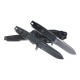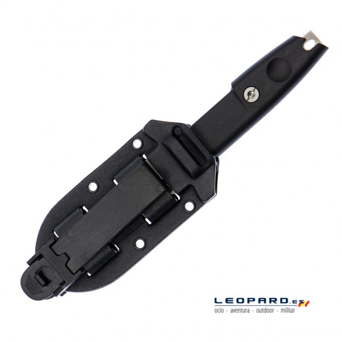 Los desarrolladores de Extrema Ratio han equipado al Defender con una funda de Kydex de color negro que mantiene al cuchillo a salvo de cualquier roce y que es compatible con el sistema MOLLE (siglas de Modular Lightweight Load-carrying Equipment, Equipo modular de transporte de carga ligero).