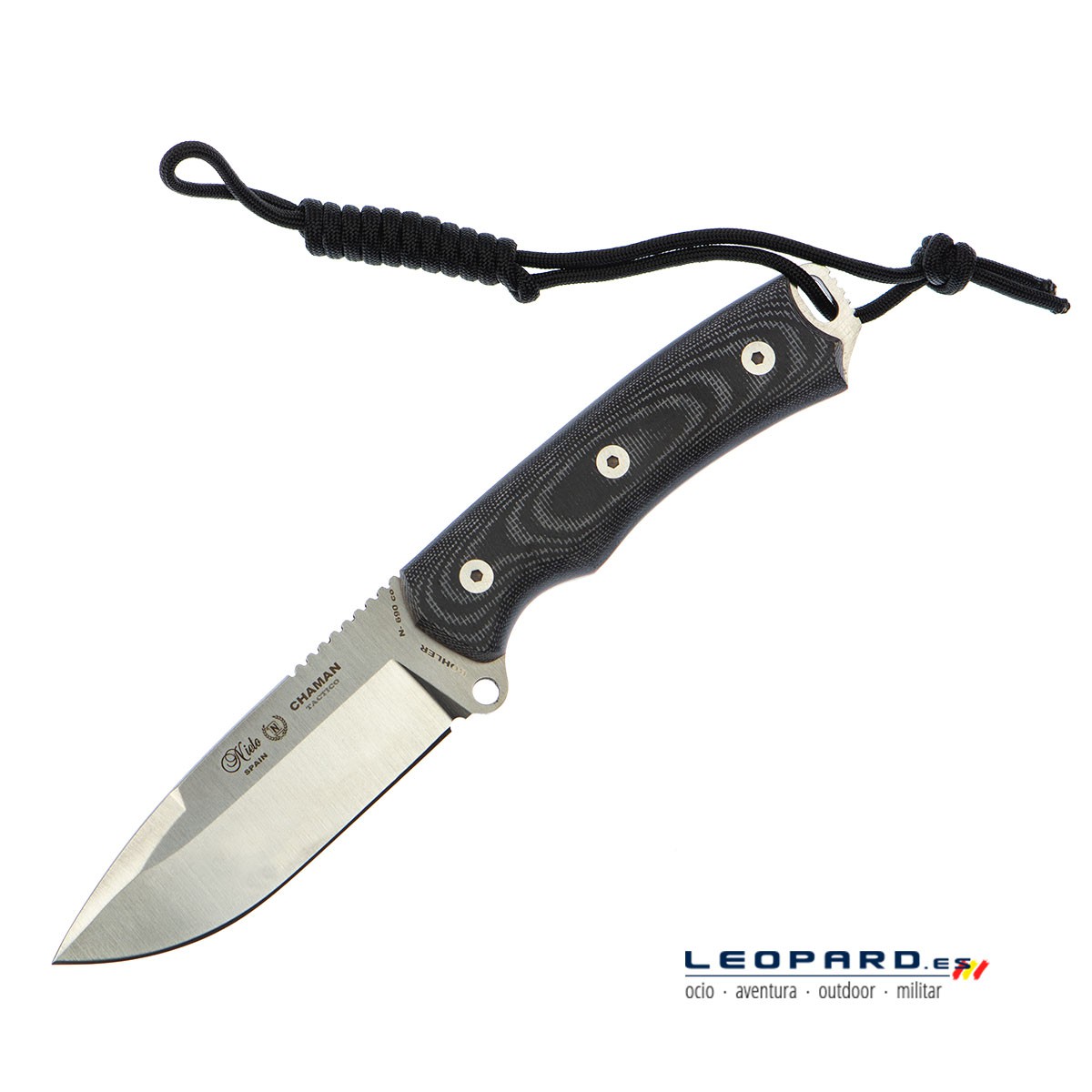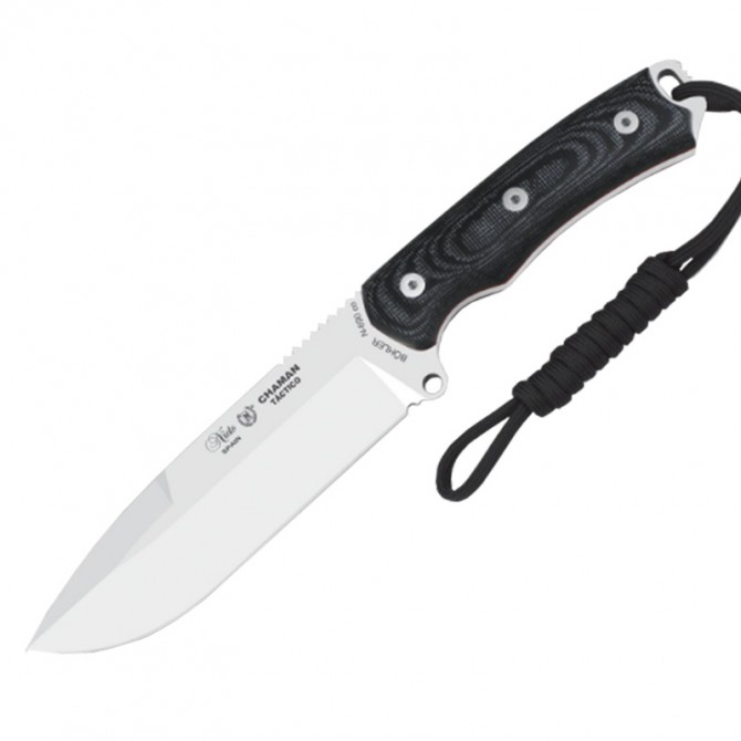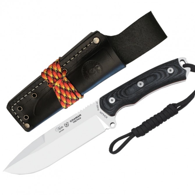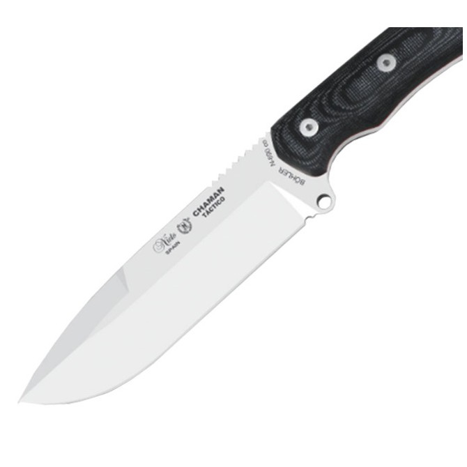 "La hoja, de tipo drop point, se clava bien en la madera y gracias a su acero de primera calidad Bohler es muy resistente. Hay otras versiones de chaman con acero vanadio, este es muy versátil"