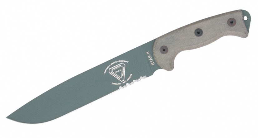 Ontario RTAK II Part Serr. 16 5/8" overall. 10 1/4" 1095 carbon steel partially serrated blade with an OD green zinc phosphate finish. Full tang. OD green linen micarta handles. Black heavy nylon sheath with liner and gear pocket.