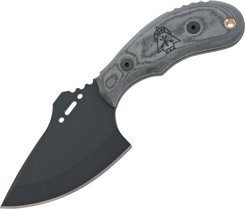 Description: Tops Wolf Pup XL. 7 1/2" overall. 3 5/8" 1095 high carbon steel blade with black traction coating. Full tang. Black linen micarta handles. Lanyard hole. Black Kydex¨ belt clip sheath.