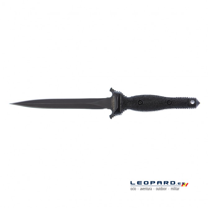 "Se trata, como su nombre indica, de una daga de supresión o eliminación. Su diseño recuerda a la clásica V-42 Stiletto de la Segunda Guerra Mundial. Es una pieza impresionante con una altísima calidad y acabados impecables. Su construcción es enteriza en acero Böhler N690 al cobalto con un acabado negro mate anti-reflejos bajo especificación N.A.T.O. La hoja, de 6,3mm. de espesor, es de tipo estilete, muy estrecha, con una punta extremadamente aguda y con doble filo. La empuñadura está realizada en poliamida fuertemente texturada para asegurar un buen agarre. Tiene un equilibrio perfecto y dispone de un pomo "rompecraneos" intercambiable por otro mas pesado para modificar el centro de gravedad. La funda es de gran calidad, con una parte interior rígida, un sistema de sujeción por presión y una funda externa compatible con el sistema M.O.L.L.E. en nylon de alta calidad. Este modelo viene con el emblema del G.I.S. (Gruppo Intervento Speciale), grupo anti-terrorista de la policía italiana"