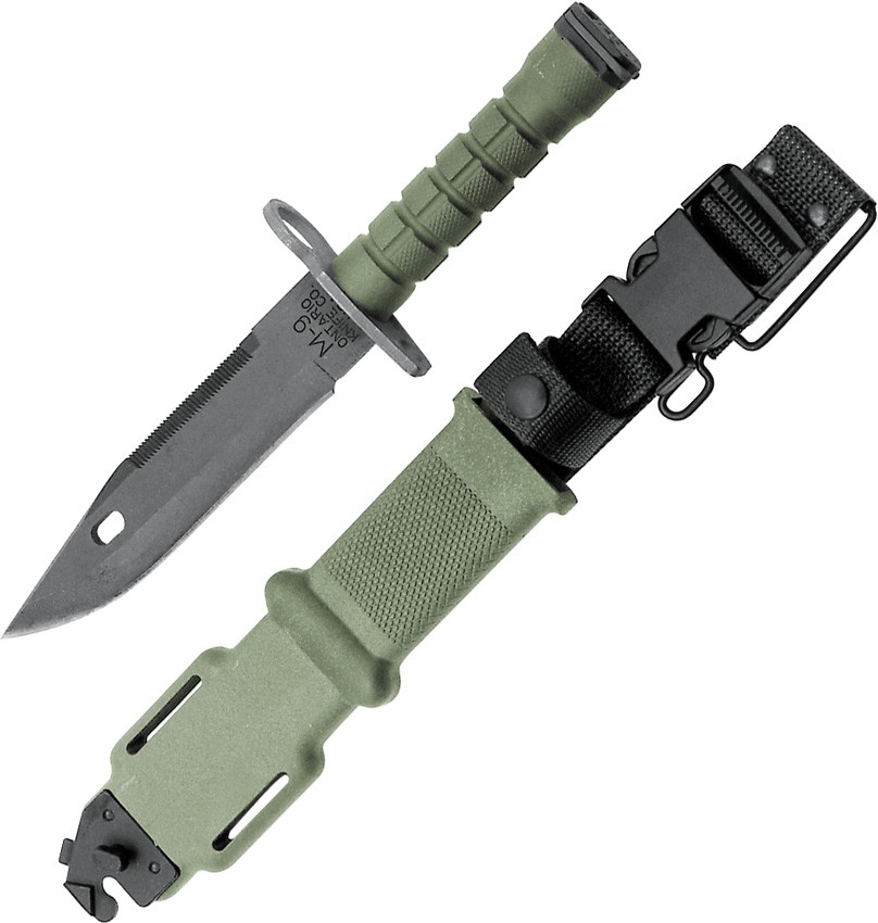 Ontario M-9 Bayonet. 12 1/8" overall. 7" 420 stainless blade with non-reflective gray phosphate finish and milled sawteeth on top edge. Olive drab thermoplastic nylon handle with phosphate coated steel guard and cap. Olive drab thermoplastic nylon scabbard with wire cutter and quick release universal military holster. Fits M-16 rifle.