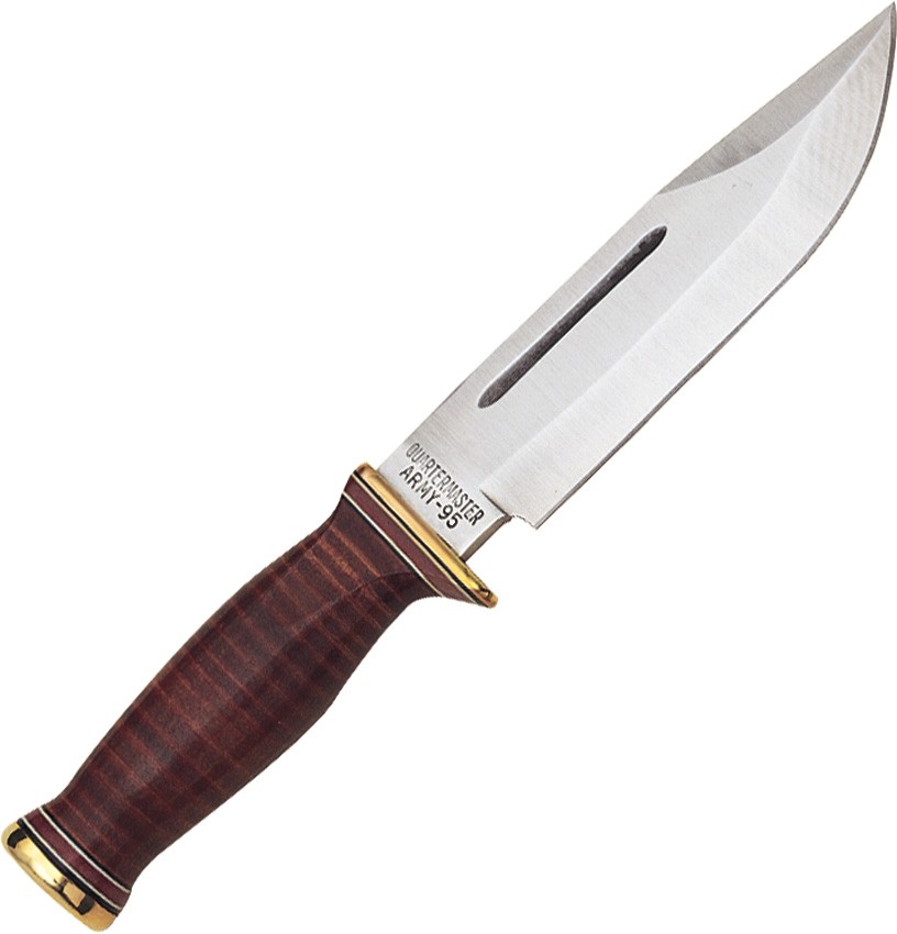 Ontario U.S. Army Quartermaster Knife. Replica of knife traded to WWII Infantry troops and used in combat. Also used as a pry bar for opening crates. The blunt end was used as a hammer. 10 3/4" overall. 6" 440A stainless blade. Stacked leather handle with brass guard and butt. Brown leather belt sheath.