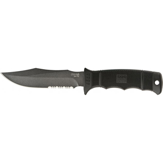SOG Seal Pup. 9" overall. 4 3/4" AUS-6A stainless gray powder coated blade with 1" serrated section. Black glass reinforced Zytel handle with lanyard hole. Black nylon sheath.