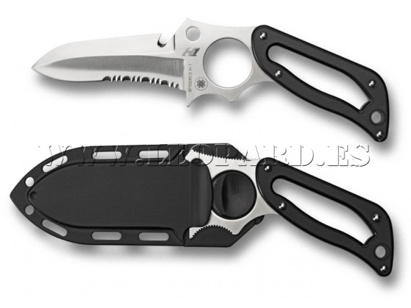 Spyderco Caspian Salt Part Serrated. 7 1/4" overall. 4 1/2" H1 steel (rustfree) partially serrated blade with finger hole and lanyard hole. Top of blade features line cutter. Full tang. Open design handle with black fiberglass reinforced nylon onlays and lanyard hole. Molded black belt sheath with adjustable arm/leg ties.