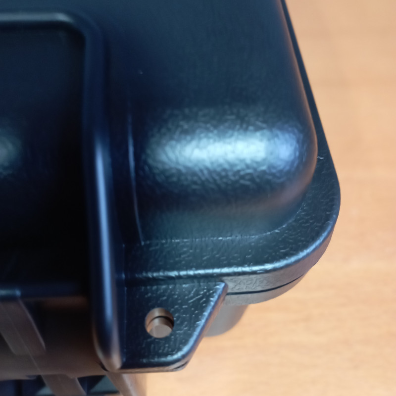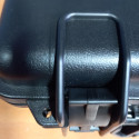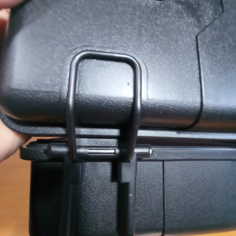 "Vista del cierre del lado izquierdo del maletín rígido FMA, sé puede ver el agujero para candado . Lo que parece la bisagra de metal no lo es es plástico y es parte de la tapa así es más resistente y protegé el cierre."