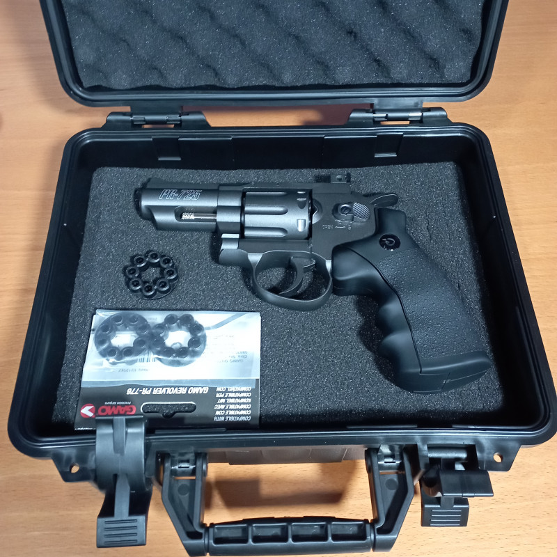 "En esta foto se puede ver mi revólver Gamo PR-725 con cargadores de reserva, aún queda espacio para cápsulas de CO2 y balines. Yo pongo la otra plancha por encima del arma como dije anteriormente."