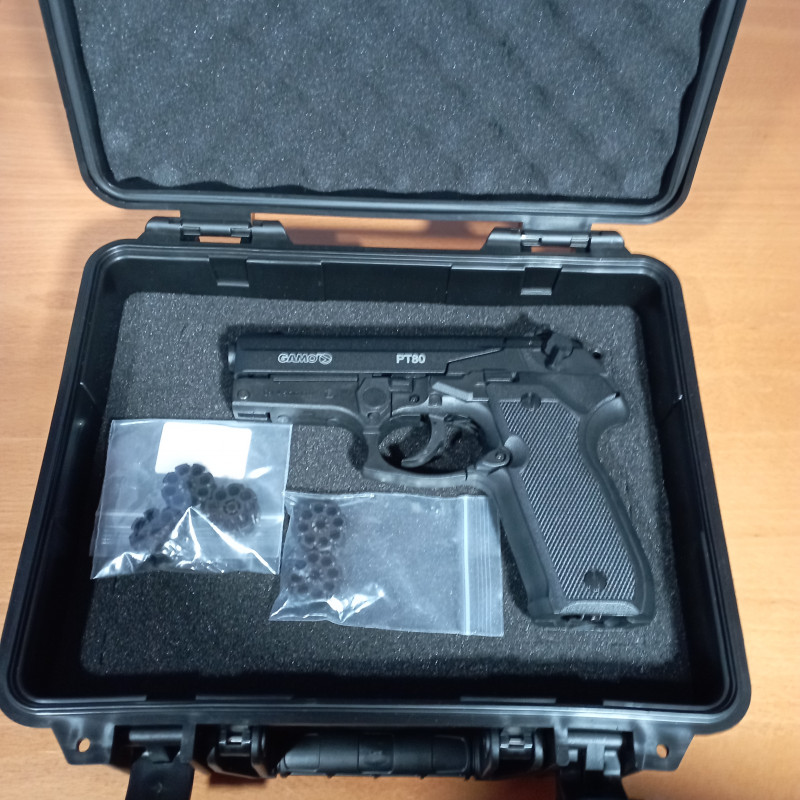 "Vista general del maletín rígido FMA con mi Gamo PT-80 y 5 cargadores extra, aún podemos meter cápsulas de CO2 y lata de balines o accesorios tácticos."