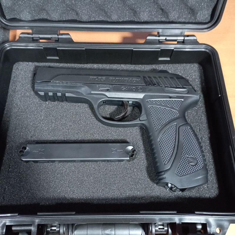 "Vista general del maletín rígido FMA con mi Gamo PT-85 BLOWBACK y un cargador extra. Podemos ver qué hay espacio para cápsulas de CO2 o latas de balines , incluso podemos poner otra armá."