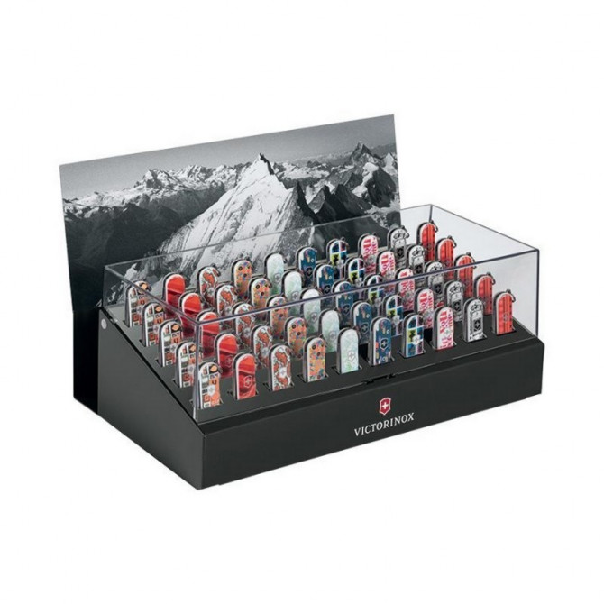 Victorinox, empresa líder de navajas multiusos fabrica esta fantástico expositor fabricado en acero de alta calidad, cumpliendo los mejores controles de calidad. Especialmente indicado para las Victorinox Classic SD (58 mm). Capacidad para 50 navajas de llavero. Protege tu colección de Classic SD de la suciedad y así las tiene ordenadas. Tapa de plástico transparente. Con patas de goma para evitar que se deslice el expositor.