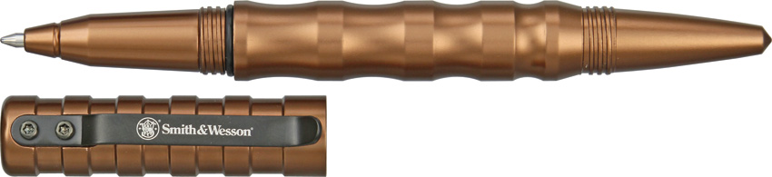 S&W M&P Tactical Pen 2 - 2nd Generation. 5 3/4" overall. Brown finish grooved T6061 aircraft aluminum construction with black finish pocket clip. Black ink. One end is pointed which could be used as a very effective defense tool. Other end is blunt and could be used as a control device. May also be used as a PDA stylus or pen.