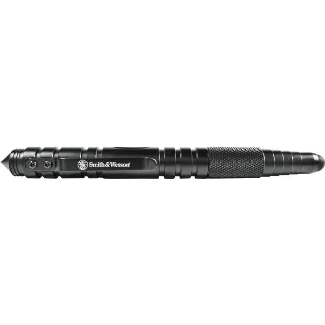 S&W Tactical Stylus Pen. 5 1/2” overall. Grooved black finish T6061 aircraft aluminum construction with black finish pocket clip. One end is pointed which could be used as a very effective defense tool. Other end is a soft stylus which can be used on most touch screen devices including iPad, Droid smart phone, Kindle eReader, etc.