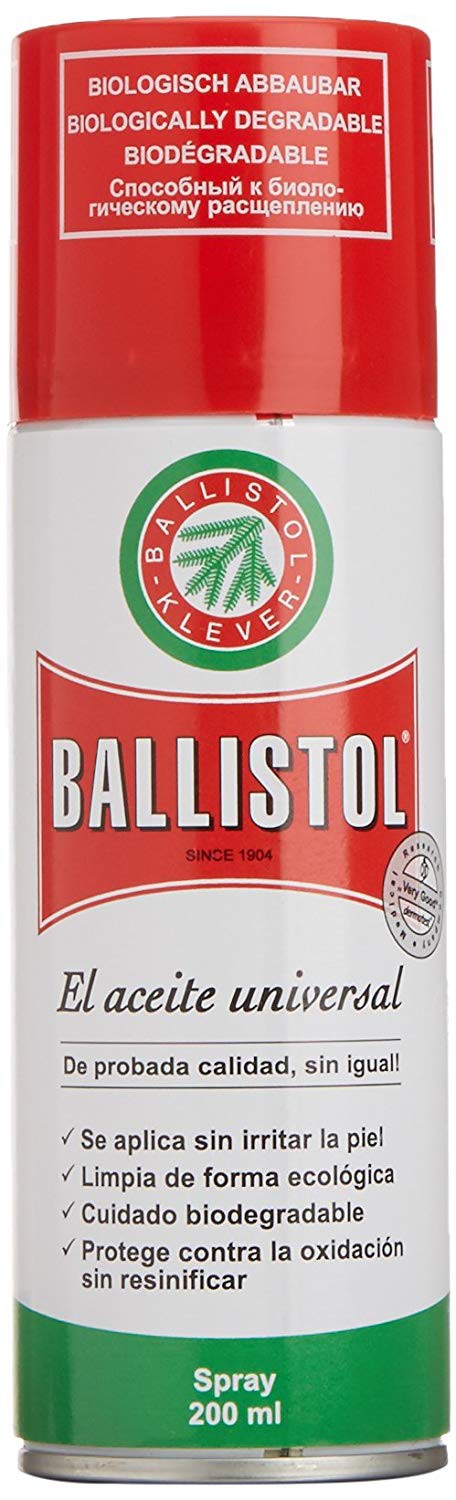 - Spray 200 ml - BALLISTOL-KLEVER PRODUCTO ALEMAN RECONOCIDO Y DE VENTA EN MÁS DE 50 PAÍSES DESDE 1874 PROTEGE, LUBRICA Y LIMPIA Utilizado mundialmente para la limpieza y el mantenimiento de armas, elimina restos de pólvora, plomo y cobre, su consistencia permite penetrar en las grietas más finas. También recomendado para su utilización en cuidado de maquinaria e instrumentos de precisión, limpieza y cuidado de pelaje de animales, materiales sintéticos, gomas, bisagras, madera, cerraduras, desatasca tornillos y efecto desinfectante. PRODUCTO AMABLE CON EL AMBIENTE, ECOLÓGICO Y BIODEGRADABLE. MADE IN GERMANY.