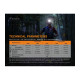 Esta linterna ha sido desarrollada en polímeros y aluminio, su fabricación en materiales de buena calidad reducen el peso de la pieza siendo muy ligera y perfecta. Cuenta con una luz LED Cree XP-G3 S3 blanco neutro y Everlight 2835 blanco, con una vida útil de 50.000 horas.