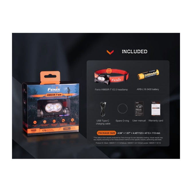 La nueva Fenix HM65R-T V2.0 es una linterna frontal profesional, ideal para la practica del trail running de alto rendimiento. Alimentada por una batería de 3400 mAh (incluida), la linterna ofrece una potencia máxima de 1600 lúmenes, un haz de luz máximo de 170 metros y un tiempo de ejecución máximo de hasta 300 horas en el modo de salida Eco (de 5 lúmenes). Con un cuerpo fabricado en aleación de magnesio, la Fenix HM65R-T V2.0 tiene una protección IP68 ante el agua y la humedad, y una resistencia a impactos y golpes de hasta 2 metros. La diadema ensanchada y ajustable en dos direcciones proporciona mayor comodidad y conveniencia para un ajuste perfecto mientras corres.