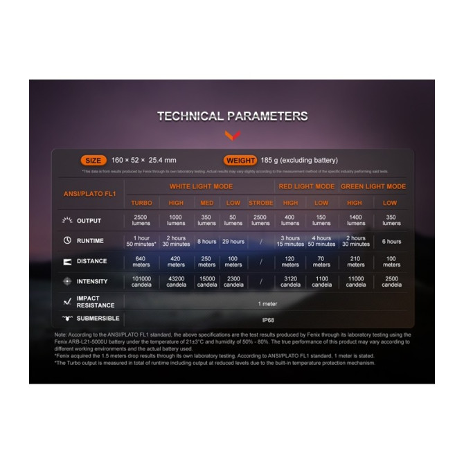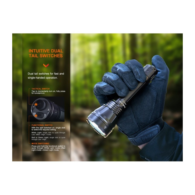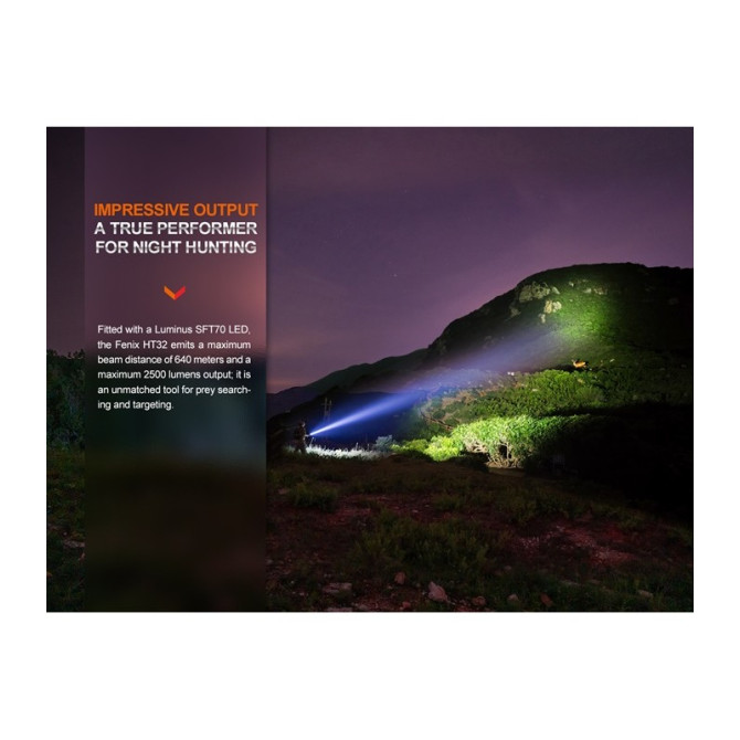 Leopard incorpora como novedad otra fantástica linterna fabricada por Fenix con Leds de 3 colores (blanco, verde y rojo), además de 4 niveles de brillo diferentes y modo stroboscópico, el modelo HT32. La lente TIR patentada por Fenix es capaz de duplicar el alcance con respecto a otro modelos similares, puede alcanzar desde los 300 hasta los 640 metros. Es la linterna perfecta tanto a nivel táctico como para caza. Incluye batería recargable ARB-L21-5000U, con una autonomía de hasta 29 horas. Cuerpo fabricado en aluminio T6 y recubrimiento antiabrasivo.