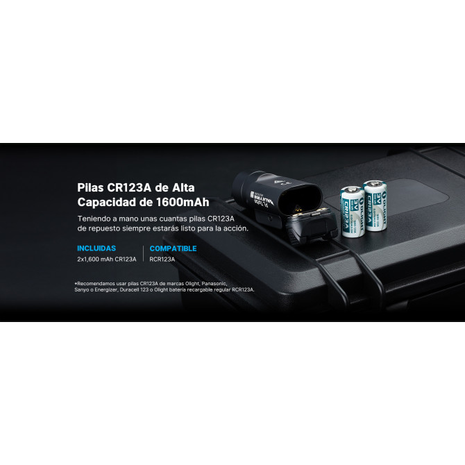Un detalle a tener en cuenta es que la linterna ha sido diseñada tanto para zurdos como para diestros. Los interruptores intuitivos y ambidiestros que lleva tienen una capacidad de activación rápida tanto de los modos habituales como del modo estroboscópico. Utiliza 2 baterías reemplazables CR123A. El cuerpo es de aluminio anodizado anticorrosivo está pensado para resistir golpes.