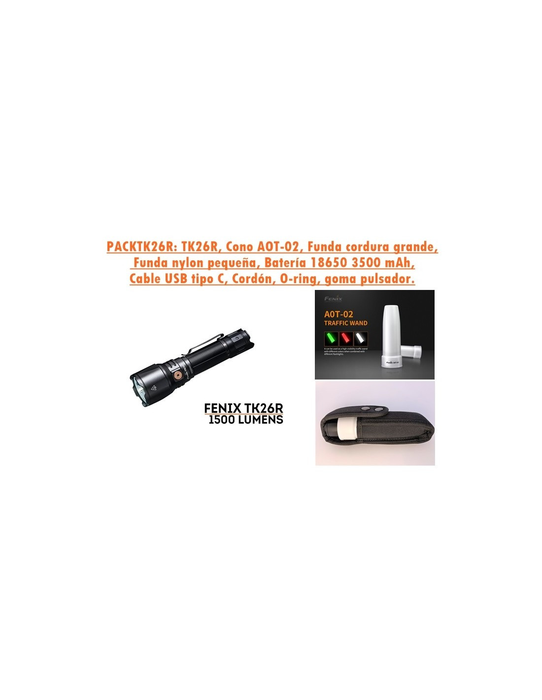 Pack linterna táctica fabricado por Fenix, modelo TK26R. Tiene una potencia máxima de luz blanca de 1.700 lúmenes, además de 200 lúmenes de luz verde y 150 lúmenes de luz roja. Tienes la posibilidad de poner 1 batería recargable 18650 o 2 baterías CR123. La batería 18650 ahora se puede cargar dentro de la linterna con el cable de carga incluido USB tipo C. Clasificación estándar IP68 (soporta temperaturas extremas de frío y calor). Cuerpo de aluminio A6061-T6 de alta resistencia.