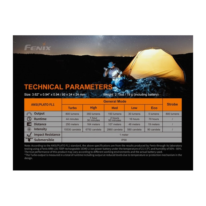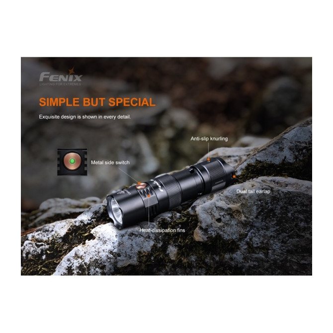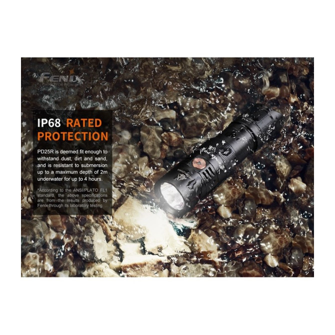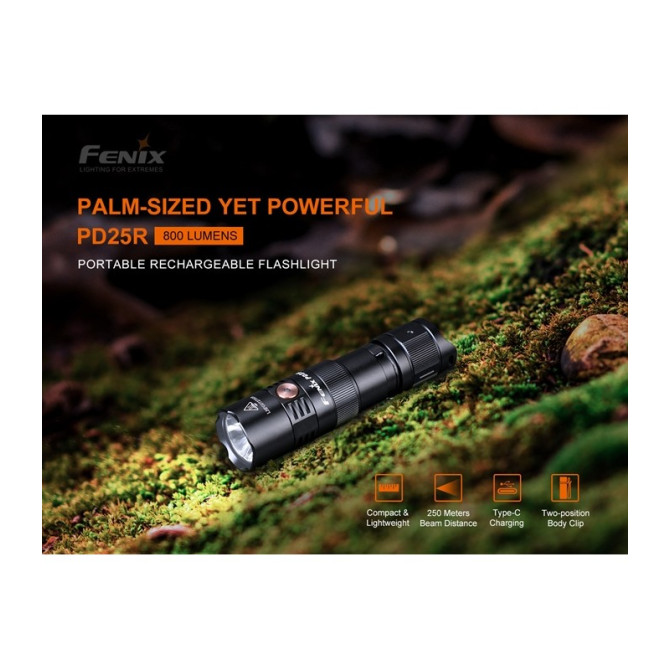 Fenix incorpora una nueva linterna PD25R, con una potencia máxima de 800 lúmenes y una distancia máxima de 250 metros. Está alimentada por una batería recargable de iones de litio 16340 y compatible también con una batería de litio CR123A. y fabricada en aluminio anodizado A6061-T6. Clasificación IP68 a prueba de polvo e impermeable.