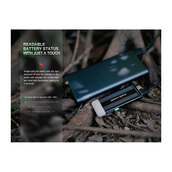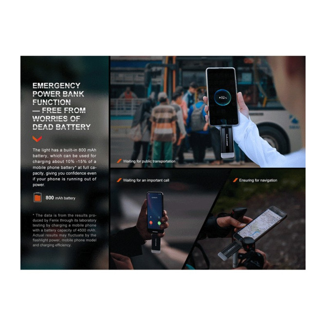 Fenix saca al mercado en 2022 una nueva linterna de llavero recargable mediante un puerto de carga USB tipo C, indicada especialmente para emergencias. Incorpora 4 leds de 100 lúmenes, 2 modos de luz y 5 niveles de brillo, y además tiene un alcance máximo de 30 metros. Puede cargar teléfonos móviles con el puerto que lleva incorporado. Indicador de nivel de batería, fabricada en aluminio A6061-T6. Incluye Llavero y cordón.