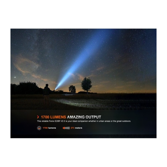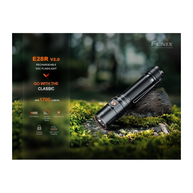 Fenix nos presenta la nueva E28R V2.0 es una linterna EDC recargable alimentada por una batería de 3400 mAh incluida. Tiene una salida máxima de 1700 lúmenes y una distancia máxima de 273 metros. Incorpora puerto de carga USB tipo C, por lo que la carga es rápida, además de muy cómoda. Es una linterna compacta, por tanto es perfecta para llevar a diario. El funcionamiento es muy sencillo, con el interruptor lateral podrás controlar todas las funciones. Protección con clasificación IP68.