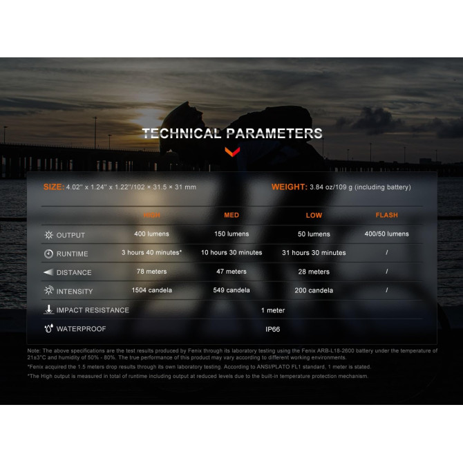 Linterna EDC, fabricada por Fenix, pensada para llevar en la bicicleta, con 400 lúmenes de potencia y un increíble precio, asequible para todos los bolsillos. Es compatible con un soporte para casco con luz de bicicleta Soporte Fenix para Casco Bicicleta incluso para la luz de bicicleta con interfaz estándar GoPro. Tiene un alcance máximo de 78 metros, y además es muy sencilla de recargar, mediante un puerto de carga USB tipo C.
