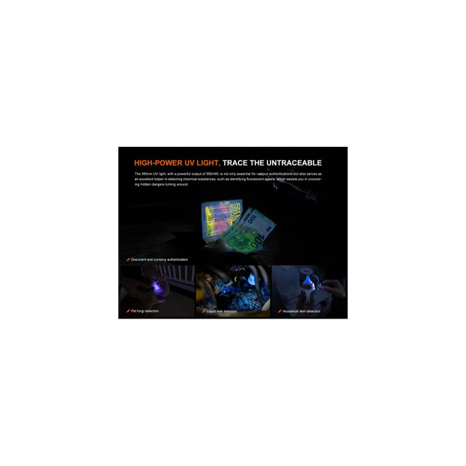 Pese a su pequeño tamaño, la E06R es impresionantemente robusta y está fabricada en metal mecanizado CNC. Con una batería incorporada de 750 mAh, esta linterna es totalmente recargable a través del puerto de carga USB Tipo C. Su luz de respiración montada en el cuello emite destellos de aviso rojos y azules e iluminación atmosférica multicolor. Más allá de su fuente de luz blanca, la linterna incluye un LED UV de 365 nm y un láser rojo (≤0,39 mW) para diversas aplicaciones como autenticación de joyas y divisas, detección de manchas y enfermedades infecciosas, enseñanza y hasta para diversión con mascotas.