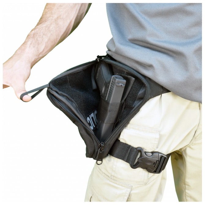 Fabricada en cordura de alta calidad. Se puede acceder al arma de manera sencilla mediante una tira de apertura rápida. Está compuesta por 4 compartimentos con cremalleras YKK. Uno de ellos pequeño para transportar guantes de látex o unos grilletes. Otro bolsillo un poco más grande donde se pueden llevar unos guantes anticorte finos, las llaves, un silbato etc.