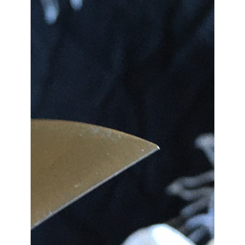 "Imagen de la punta de la navaja opinel n 12 inoxidable, viene un poco enrollada, lo que hace que se pierda material al engancharse, no viene bien, aún así solo el de 1 mm, pero no es lo ideal empezar perdiendo material de la punta antes de usarla. No se si habrá sido la fruto de la casualidad o es un fallo que trae este tipo de navaja de fábrica, pero sería algo a mejorar por lo menos en la que me vino."