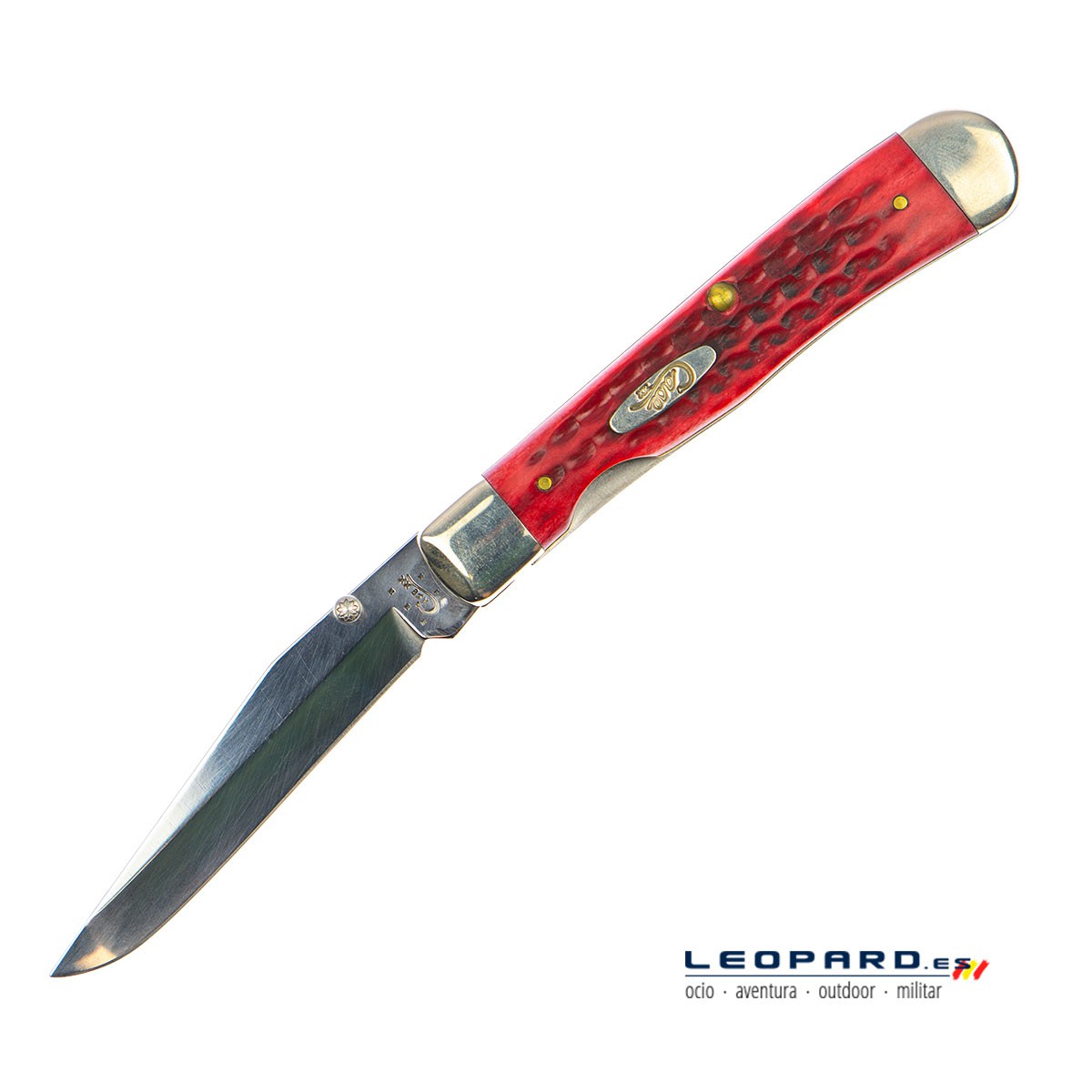 Case TrapperLock. 6154LSS pattern. 4 1/8" closed linerlock. Stainless clip blade with thumb stud. Pocketworn old red jigged bone handles. Nickel silver bolsters and inlay shield. Gift tin.